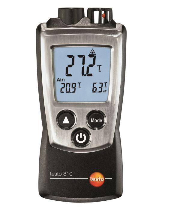 Mit dem Infrarot-Thermometer testo 810 messen Sie gleichzeitig die Lufttemperatur und die Oberflächentemperatur eines Messobjekts – und zwar ohne Kontakt. Die Temperaturdifferenz zeigt Ihnen das Infrarot-Temperaturmessgerät automatisch an. Damit eignet es sich besonders für den Einsatz im Heizungs-, Klima- und Lüftungshandwerk.